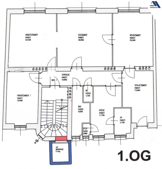 - Raumaufteilung: 5 Büroräume, Besprechungsraum, Küche, Abstellraum, Bad, 1 WC