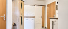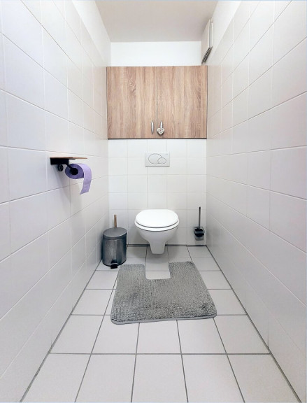 - Das Badezimmer ist gefliest und mit einer Badewanne, Dusche, Waschbecken und Waschmaschinenanschluss ausgestattet.