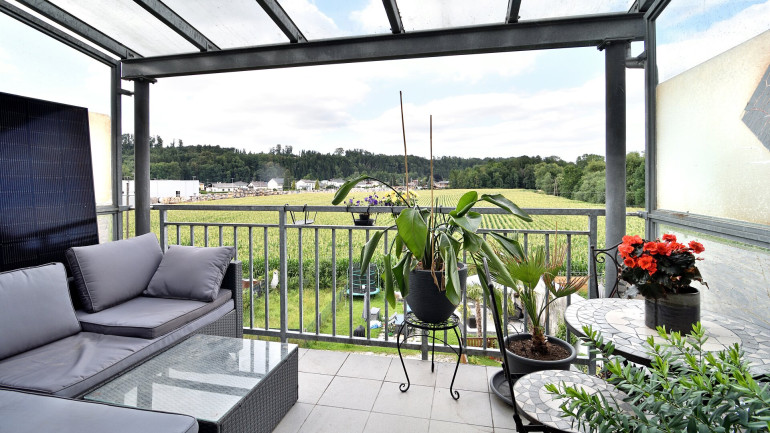 - Die Loggia hat einen gefliesten Boden und einen unverbauten Blick ins Grüne.
