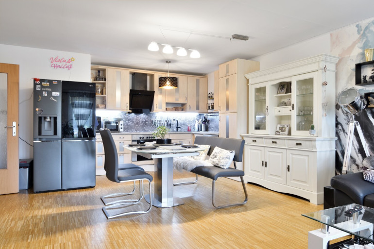 - Die Küche befindet sich direkt anschließend zum großzügigen Wohn- und Esszimmer und ist bis auf einen Kühlschrank vollausgestattet mit Backrohr, Herd mit Dunstabzug und Geschirrspüler.