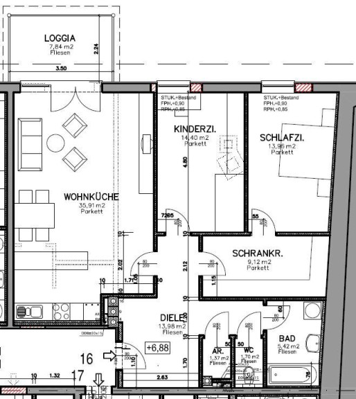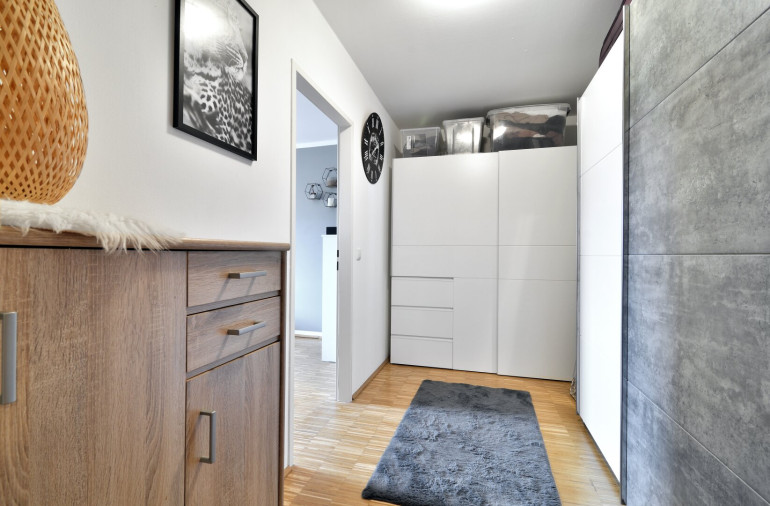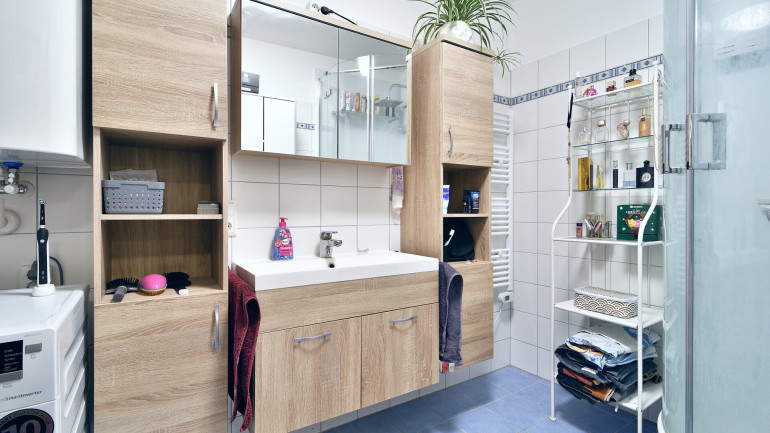 Ebenfalls besitzt man über das Wohnzimmer einen direkten Zugang zur Loggia, die zusätzlichen Freiraum im Alltag schafft. Weiters stehen ein Elternschlafzimmer sowie zwei weitere Zimmer zur Verfügung, die flexibel als Kinderzimmer, Büro oder Schrankraum genutzt werden können. Das Badezimmer ist mit Dusche, Waschbecken und einem Waschmaschinenanschluss ausgestattet, die Toilette ist separat ausgeführt.