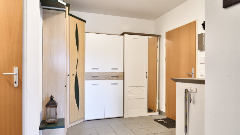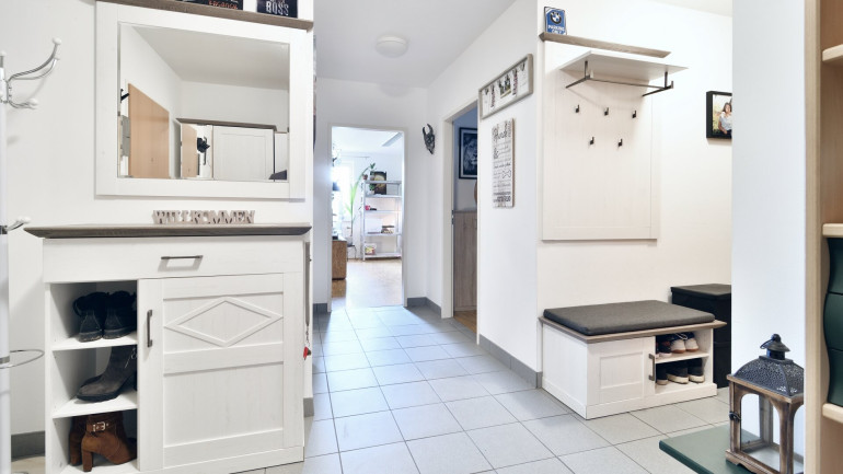 Vom Eingangsbereich aus gelangt man in den großzügigen Vorraum, von dem aus alle Räume zentral zu erreichen sind. Der offene Wohn-/Essbereich mit einer hochwertig integrierten Küche bildet das Herzstück der Wohnung.