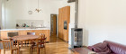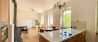Helles, geräumiges Wohnzimmer mit offener Küche und Kamin