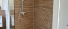 2OG: Schlafzimmer mit offenem Duschbereich, WC und Urinal sowie Dachterrasse mit Klarsichtgeländer Gut belichtetes Stiegenhaus mit Dachöffnungen