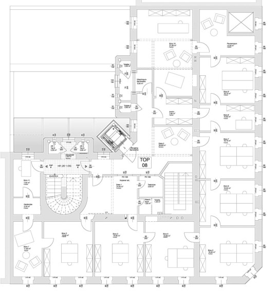 Das Büro erstreckt sich über die gesamte Etage und verfügt über eine durchdachte Raumaufteilung. Es umfasst: