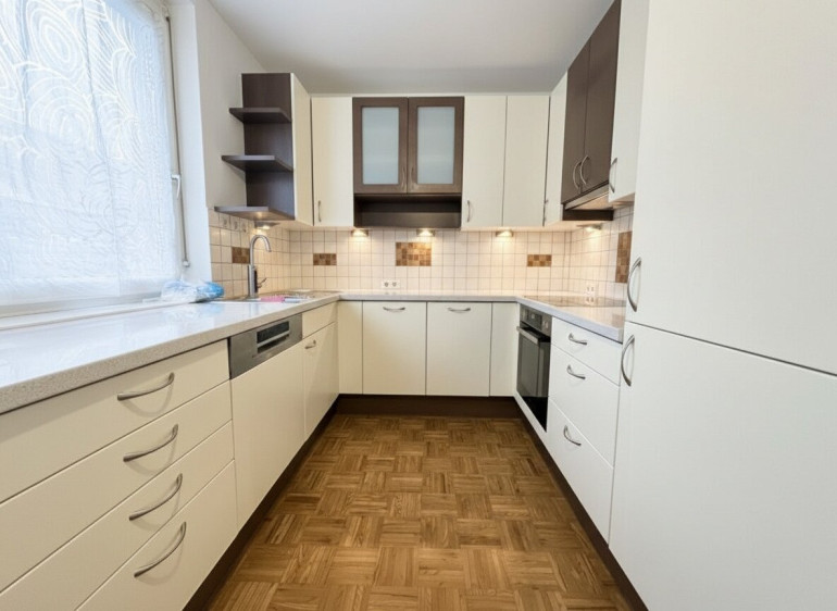 Parkett, Dielenboden, Fliesen, Fernwärme, Einbauküche, Wohnküche / offene Küche, Bad mit Fenster, Badewanne, Tiefgarage
