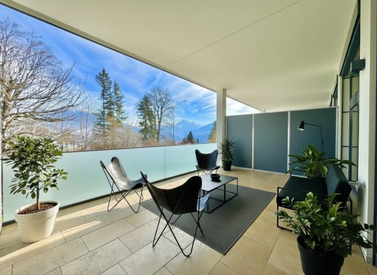 • Terrasse/Loggia mit 24,54 m²: Die großzügige, verflieste Terrasse mit hochwertiger 3-Scheiben-Verglasung und elektrischen Außenraffstoren (Ennemoser) ist ein absoluter Hingucker.