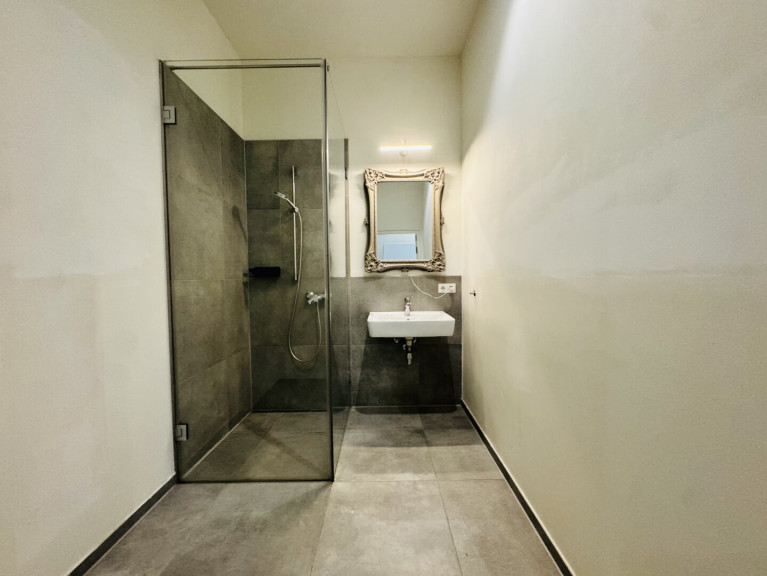 • Badezimmer: Das luxuriöse Badezimmer besticht mit lasergeschnittenen Fliesen und einer barrierefreien Dusche. Zusätzlich verfügt es über eine freistehende Badewanne in Weiß/Anthrazit mit nostalgischen Metallfüßen – eine perfekte Mischung aus modernem Komfort und stilvollem Vintage-Charme.