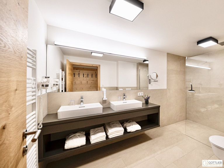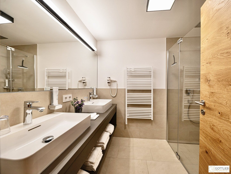 + zwei Bäder mit bodengleichen Duschen, Waschbecken sowie Toilette