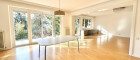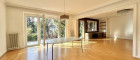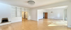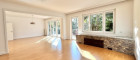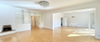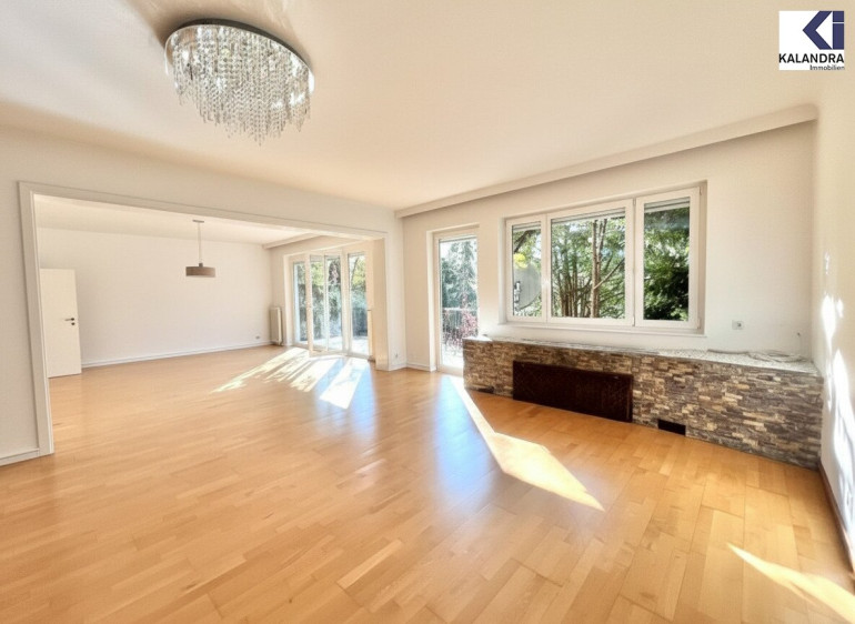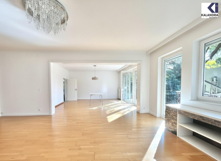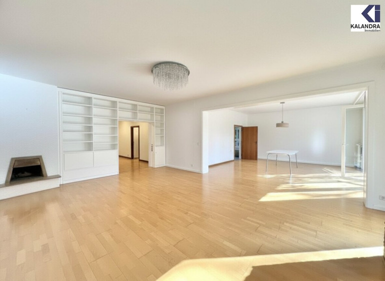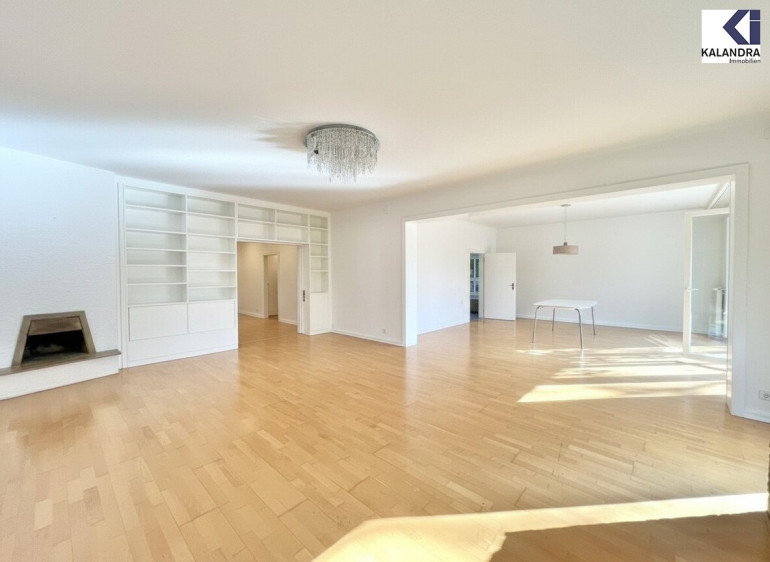 central anteroom, large living/ dining room (approx. 61m²) with exit to a 12m² south-facing, garden-side terrace, kitchen with dining place (approx. 15m²), 3 bedrooms (2 x approx. 13m², 1x approx. 18m²), one smaller kabinett (approx. 9m²) with shower, a bathroom with bathtub and bidet, 2 separate toilets, walk-in cloak-/ storage room.