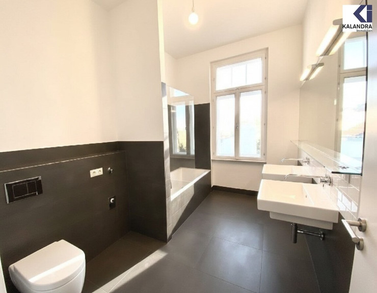 - Badezimmer mit Badewanne, Doppelwaschtisch und WC,