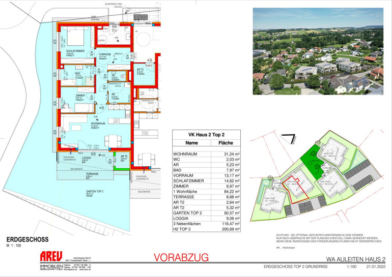 Raumaufteilung: Vorraum, Bad, WC, Abstellraum, Wohnraum/Essen/Kochen, Schlafzimmer, Zimmer