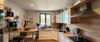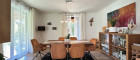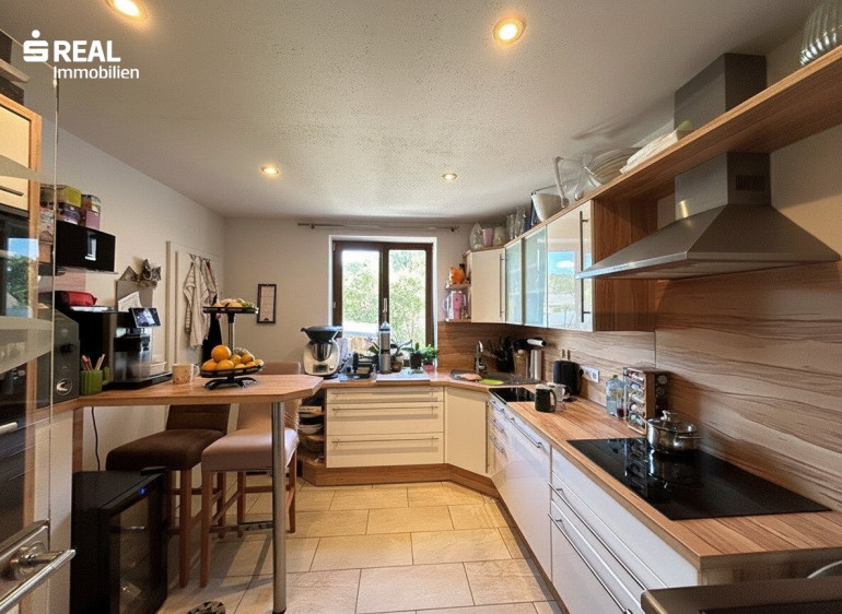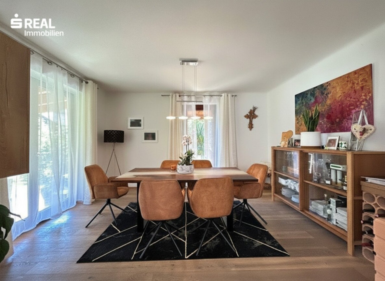 Die untere Wohnebene ist aufgeteilt in Küche, Wohnzimmer, Essbereich und Gästetoilette. Der Wintergarten sorgt für zusätzlichen Wohnraum auch bei kälteren Tagen. Über das Esszimmer gelangt man auf die überdachte Terrasse, ein Schattenplatz für angenehme Sommertage.