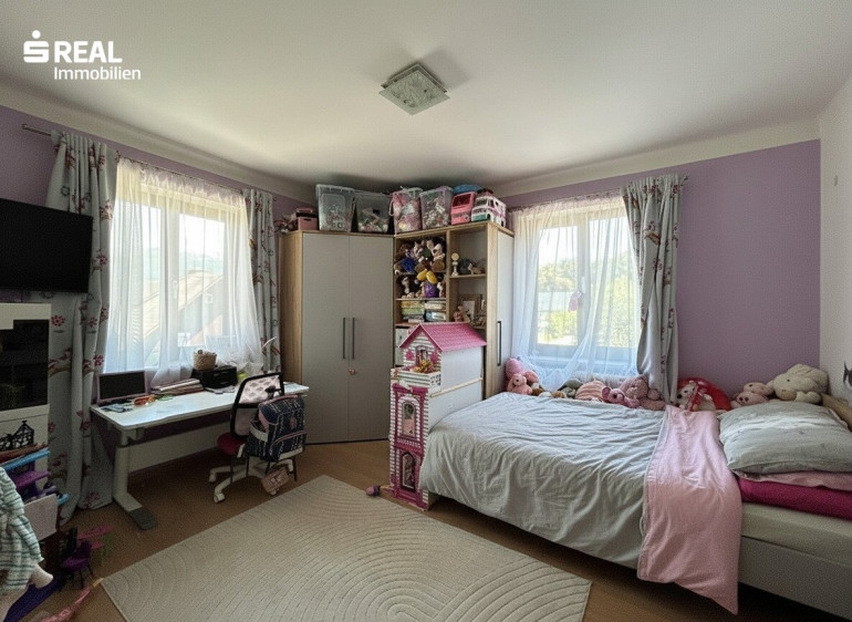 Im oberen Wohnbereich befinden sich das Schlafzimmer, ein Ankleidezimmer und ein Kinderzimmer sowie das modern gestaltete Badezimmer. Ebenfalls ein Zugang zu einem Wintergarten, da dieser zweigeschossig errichtet wurde und noch als Highlight ein erhöhte Terrasse.