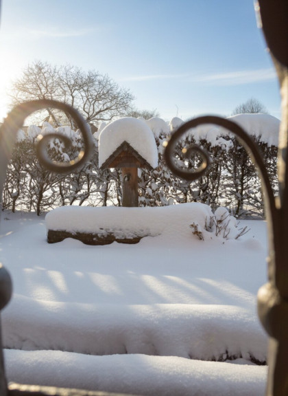 Umrahmt von einer gepflegten Buchenhecke, bietet der Garten Platz für ein gemütliches Beisammensein oder auch nur Ruhe und Erholung. Obstbäume und blühende Sträucher sowie zwei Granitbrunnen unterstreichen die Harmonie dieses Ensembles. Ein idyllischer Platz für all jene, die das Besondere suchen.