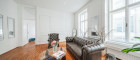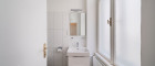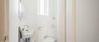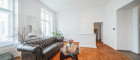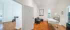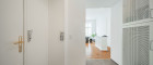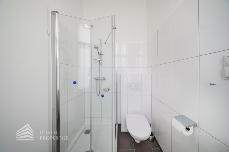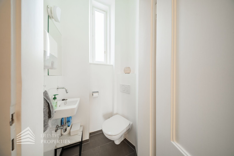 Rechts beim Eingang befindet sich das Badezimmer mit Dusche und Toilette und eine weitere separate Toilette. Alle Räume verfügen über einen eleganten Parkettboden.