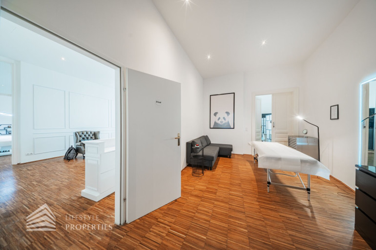 Links vom Vorraum erreicht man das elegante Empfangszimmer mit seiner exklusiven Ausstattung. Links vom Empfangszimmer erreicht man das erste Behandlungszimmer, dieses mit zwei elektrischen Kosmetikliegen, Lupenlampen, Hocker und einen Arbeitswagen sowie einigen Möbel ausgestattet ist. Rechts vom Empfangszimmer gelangt man in ein weiteres Behandlungszimmer, dieses zurzeit als Massagezimmer dient und mit einen Massagetisch, einen Arbeitswagen und weiteren Einrichtungsgegenständen ausgestattet ist. Einen Raum weiter erreicht man das dritte Behandlungszimmer. Rechts befindet sich die vollausgestattete Küche, diese über viel Stauraum und drei Spinte für das Personal verfügt.