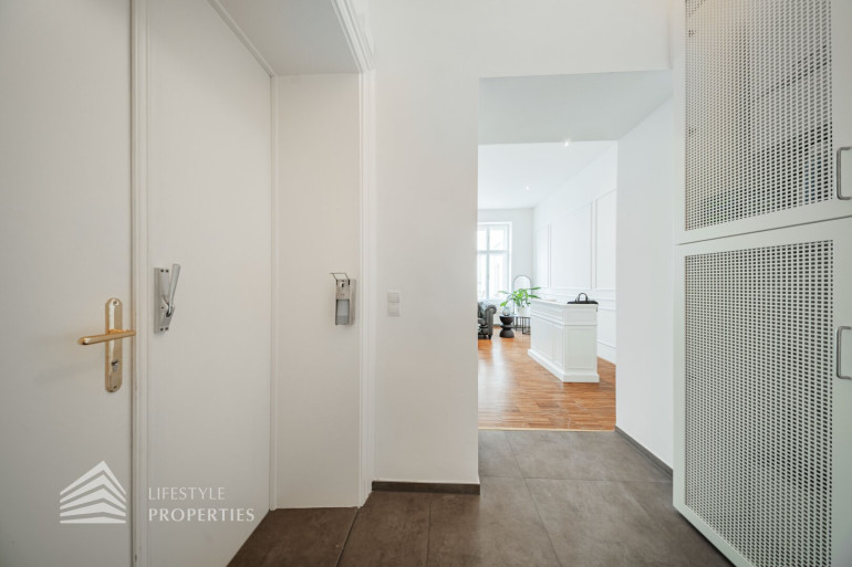 Beim Betreten des Objektes befindet man sich direkt im Vorzimmer, dieses genug Platz für eine Garderobe bietet und mit grauen Fliesen ausgelegt ist.