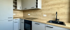 Küche mit moderner Einbauküche (Herd, Backofen, Geschirrspüler, Abwasch, Kühl-Gefrierkombination)