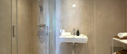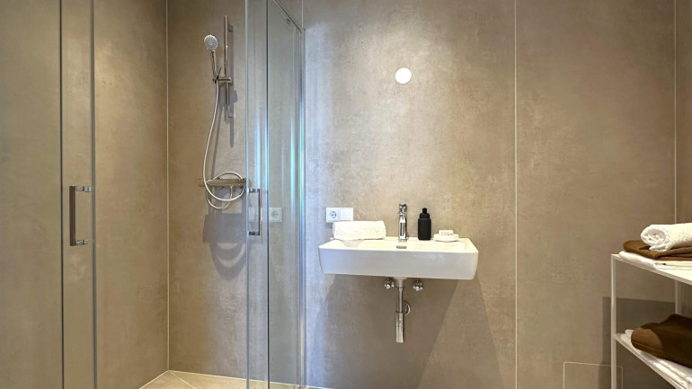 - Ein vollausgestattetes Badezimmer mit Dusche, Waschbecken und Waschmaschinenanschluss