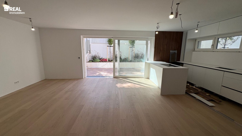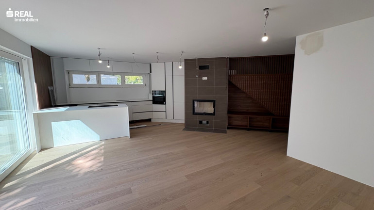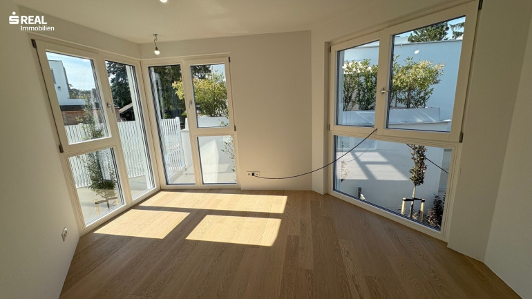 Edler österreichischer Premium-Parkettboden sorgt in allen Wohnbereichen für ein warmes Ambiente, ergänzt durch elegante Holz-Alu-Fenster, die Energieeffizienz mit stilvollem Design verbinden.