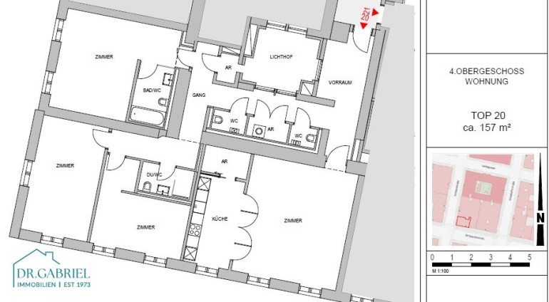 - Vorraum, - Wohnraum, - Küche optisch abgetrennt, - drei Schlafzimmer, - ein Wannenbad, - ein Duschbad, - vier WC