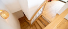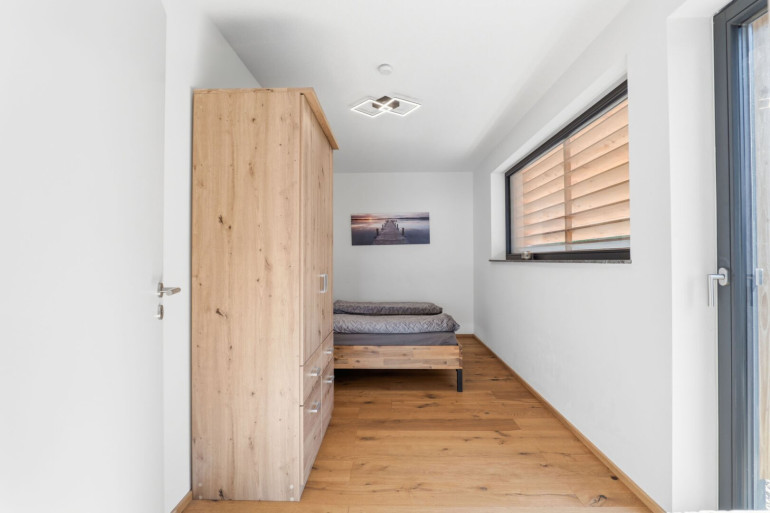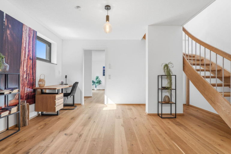 Über eine stilvolle Ecktreppe gelangen Sie in die untere Etage. Hier erwartet Sie ein großzügiger Büroraum, ein weiteres Schlafzimmer mit begehbarem Kleiderschrank sowie eine zusätzliche Terrasse. Von dort aus erreichen Sie Ihren privaten Garten mit über 50 m² Fläche – ein perfekter Rückzugsort im Grünen. Ein modernes Badezimmer sowie ein praktischer Abstellraum vervollständigen diese Ebene.