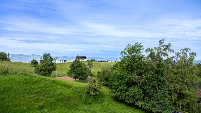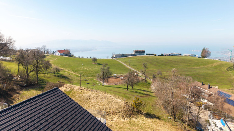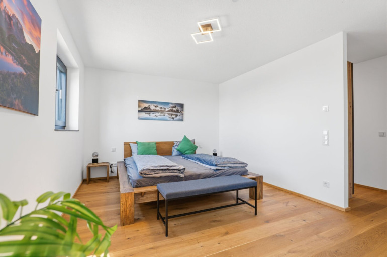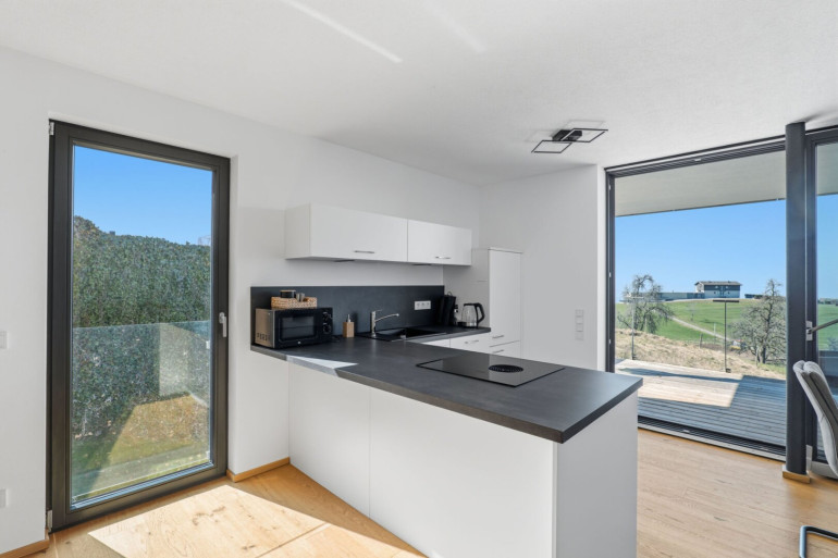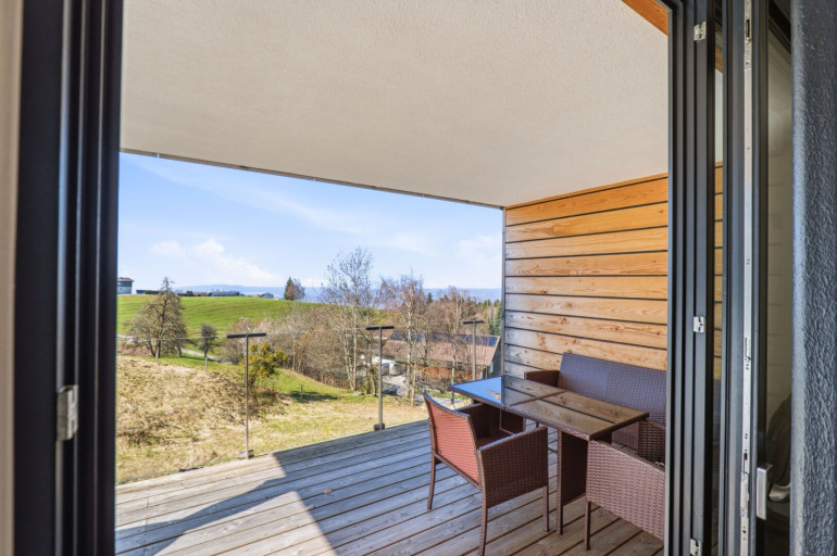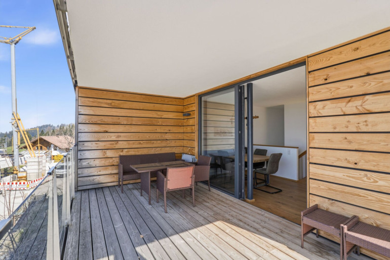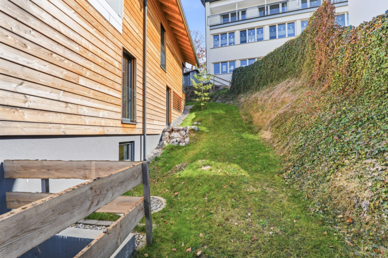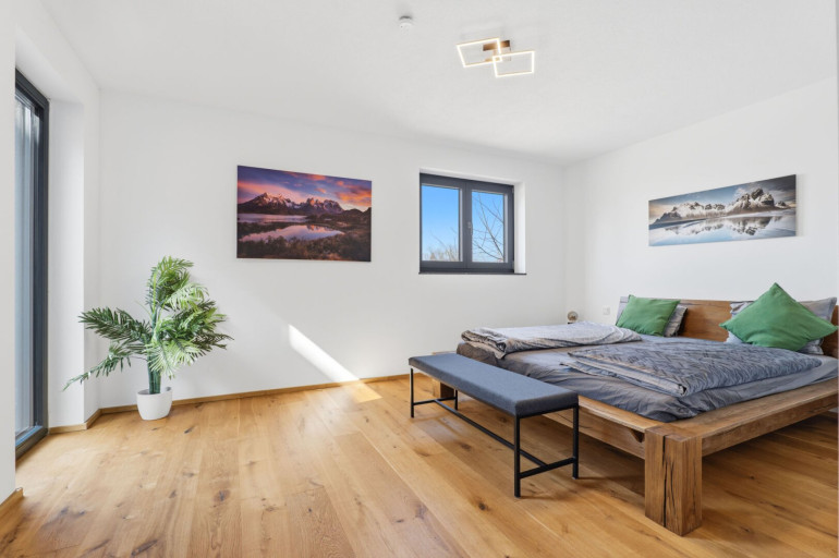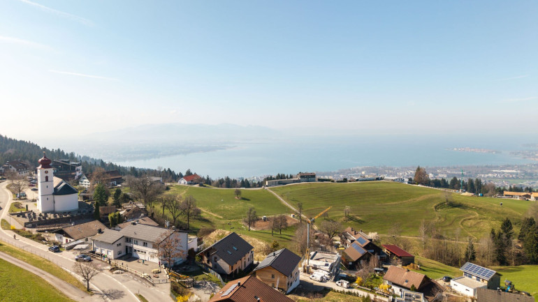 Großzügige, raumhohe Fenster sorgen bereits beim Eintreten für eine helle und freundliche Atmosphäre. Ein echtes Highlight ist die weitläufige Terrasse mit beeindruckendem Panoramablick auf den Bodensee, die Schweizer Alpen und die umliegende Naturlandschaft. Auf der oberen Ebene befinden sich zudem ein offener Wohn- und Essbereich mit moderner Einbauküche, ein geräumiges Schlafzimmer sowie ein separates Gäste-WC.