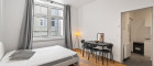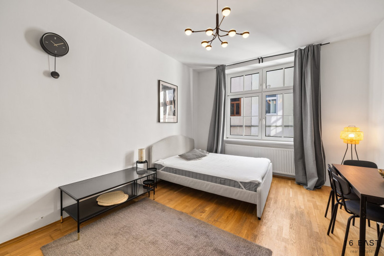 Die helle und ruhige 1-Zimmer-Wohnung mit großen Fenstern und Blick in den grünen Innenhof befindet sich im 2. Stock (ohne Lift) im hinteren, besonders ruhigen Teil des Hauses.