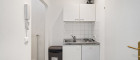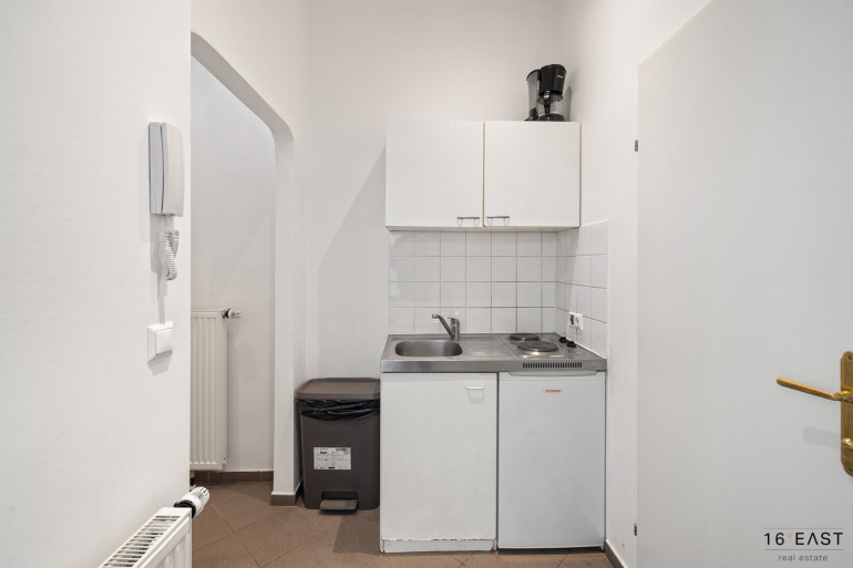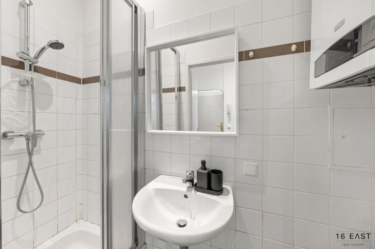 Vom kleinen Vorraum gelangt man direkt in die Küche. Zusätzlich verfügt die Wohnung über ein großes Zimmer sowie ein separates, kompaktes Badezimmer mit Dusche, Waschbecken und Waschmaschinenanschluss. Ein separates WC ist ebenfalls vorhanden.