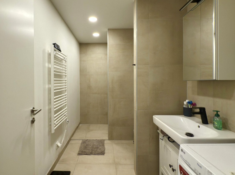 Hochwertig ausgestattetes Badezimmer mit Walk-in-Dusche, Hänge-WC und optionalem Waschtrockner