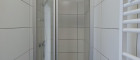 - Badezimmer mit Dusche, Handwaschbecken, Handtuchtrockner