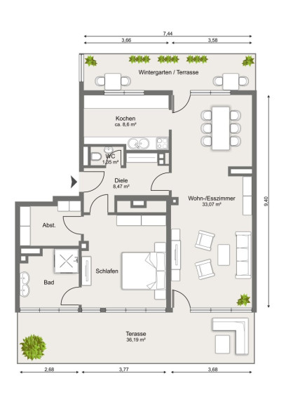heller Wintergarten auf der Nordostseite – ideal als erweiterter Wohnraum oder gemütlicher Essbereich