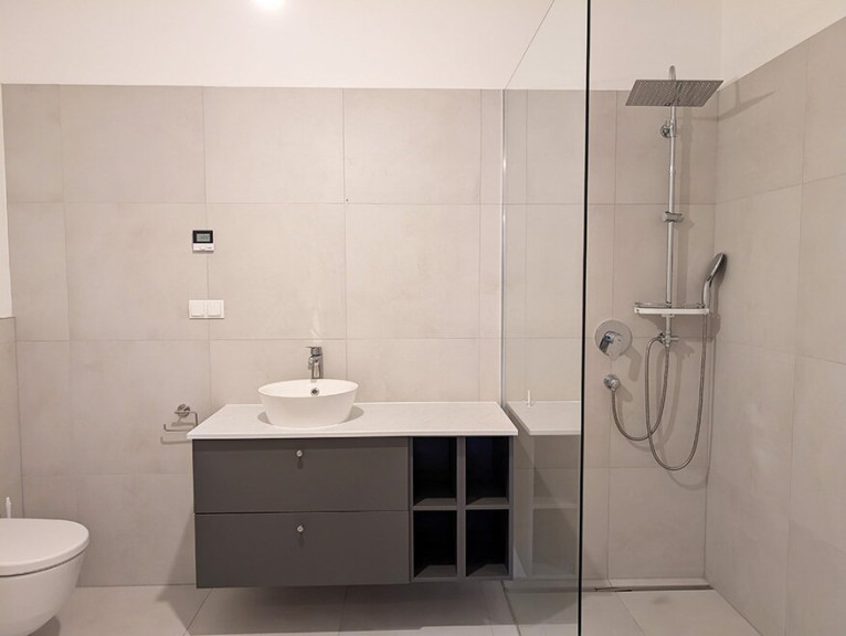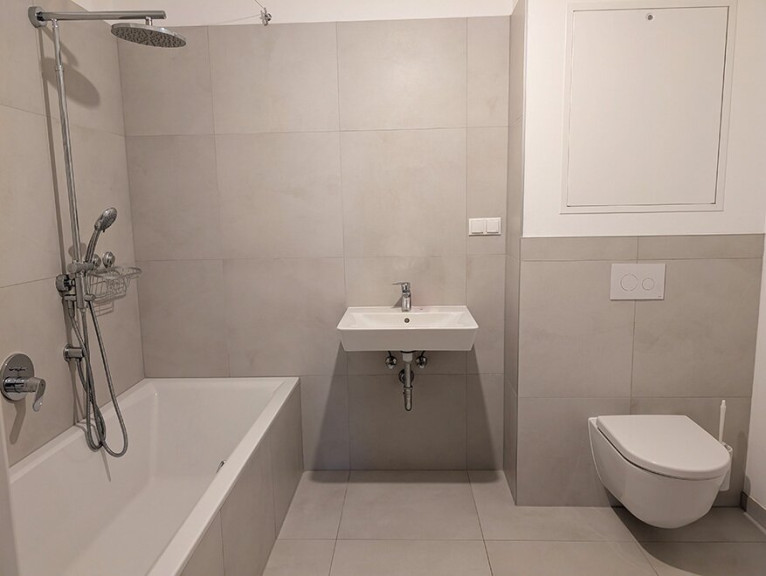 Diese Wohnung befindet sich im ersten Obergeschoss und verteilt sich auf ca. 94 m². Dazu gehört eine Balkonfläche von ca. 23 m². Bei diesem Wohnungstyp haben wir versucht, einen sehr zeitgemäßen Grundriss zu geschaffen. Durch die Integrierung eines Schlafzimmers mit eigenem Bad, Abstellraum und Kochnieschenoption kann dieser Abschnitt in eine eigene Wohneinheit in der Gesamtwohnung separiert werden. Von einem abgetrennten Masterbedroom für die Eltern bis zu einem Jugendzimmer, Pflegemöglichkeit für Angehörige, Rückzugs- Aufenthaltsbereich für eine 24 Std. Pflegebetreuung, Untervermietungsmöglichkeit, WG-Vermietung oder als Homeoffice, ist hier alles möglich. Die beiden Badezimmer sind mit Badewanne oder Dusche und WC ausgestattet. Der geräumige Wohnbereich mit großzügigen Belichtungsflächen und einer offen angeschlossenen Küche ist das Zentrum der Wohnung. Ebenfalls inkludiert ist ein Kellerabteil und ein Tiefgaragenplatz. Ein zweiter Tiefgaragenplatz kann bei Interesse zusätzlich noch erworben werden.