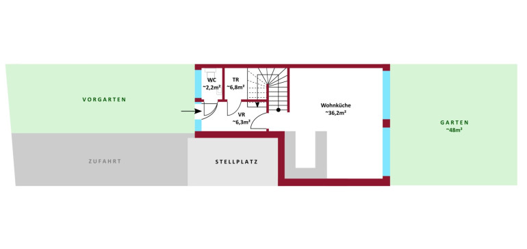 - Großzügiges Wohnküche ca. 36 m² mit Gartenzugang