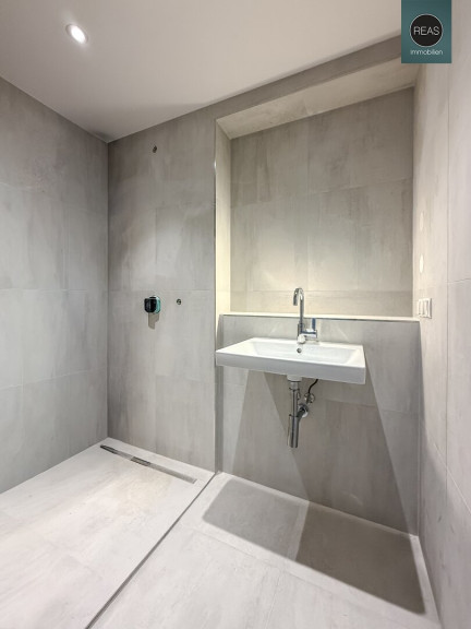 - Badezimmer mit "Walk in" Regendusche oder Badewanne Großformatige Boden- und Wandfliesen