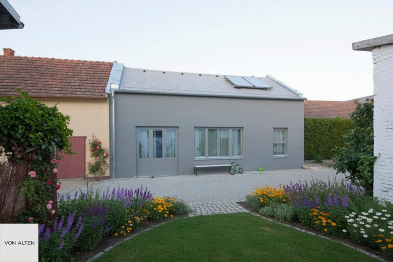 Diese besondere Immobilie, erbaut im Jahr 2011, befindet sich auf einem ca. 175 m² großen Grundstück und bietet eine Wohnfläche von ca. 68 m², verteilt auf zweieinhalb Ebenen. Das Haus verfügt über zwei Schlafzimmer, ein Badezimmer mit Dusche und Waschbecken sowie eine separate Toilette mit Waschmaschinenanschluss und eigenem Waschbecken. Die Haus wurde in Ziegelmassivbauweise errichtet, neben der Langlebigkeit und der Wertbeständigkeit sorgt diese Bauweise auch für eine gute Isolierung – sowohl von unten als auch an der Fassade. Dadurch bleibt das Haus im Sommer angenehm kühl, unterstützt durch einen installierten Ventilator. Beheizt wird das Haus mit einer Pelletheizung. Für die Warmwasserbereitung wurde eine thermische Solaranlage installiert.
