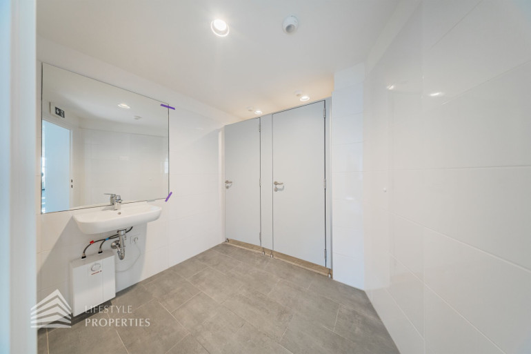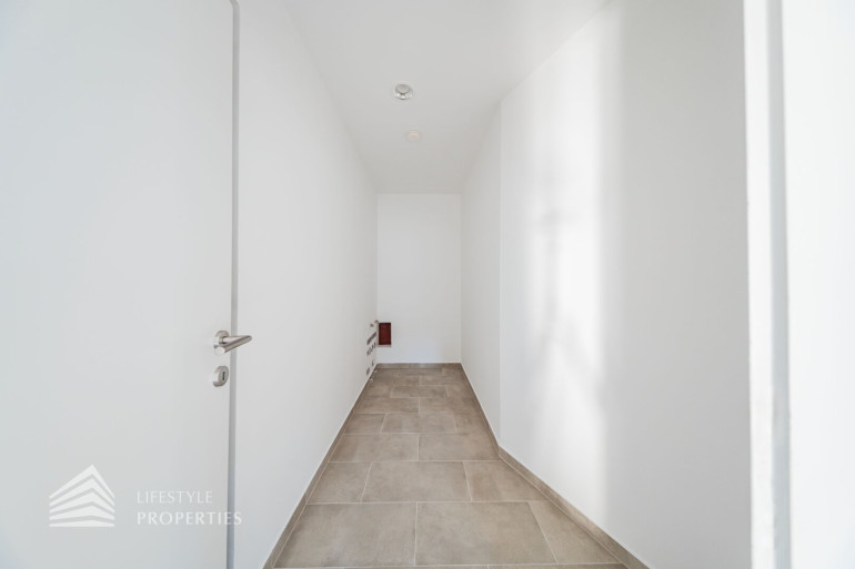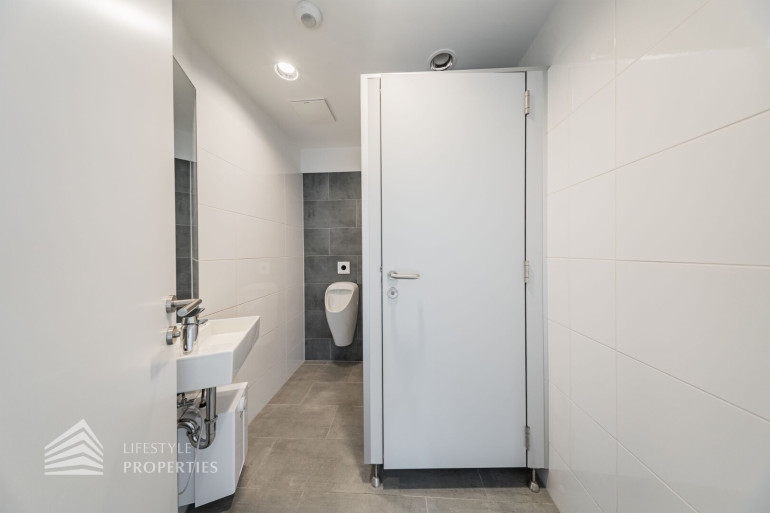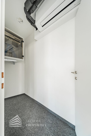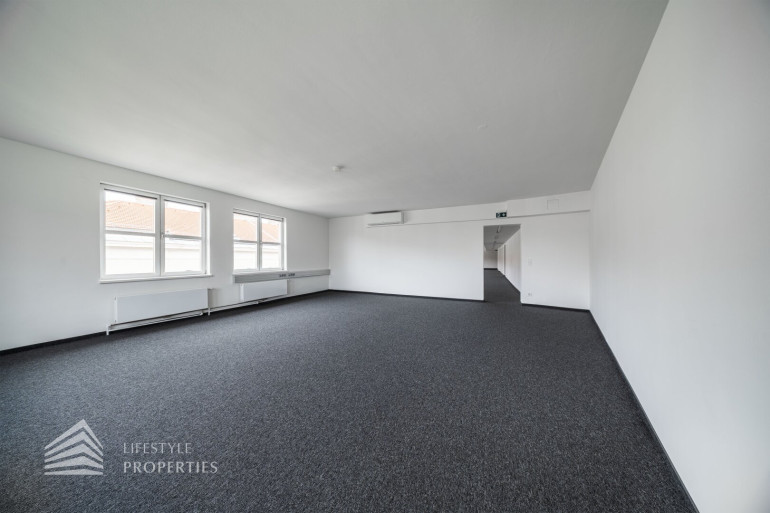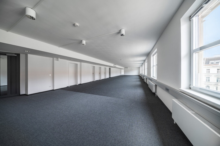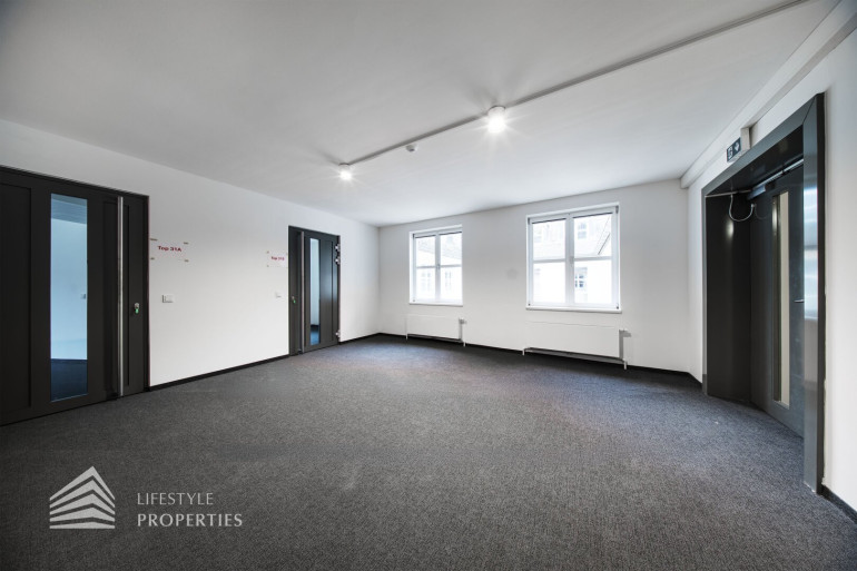 Beim Betreten des Büros steht man direkt im ca. 25 m² großen Vorraum, dieser mit dem angrenzenden Büro geteilt ist. Beim Eingang befindet sich der ca. 21 m² große Empfang. Durch einen ca. 30 m² langen Gang gelangt man zu den einzelnen Büroräumen. Auf der linken Seite des Ganges befindet sich ein Serverraum, ein Sozialraum mit einer Teeküche, die Toiletten für die Damen und Herren und ein Abstellraum. Die Fläche des Heizraumes wird auf vier Einheiten aufgeteilt.
