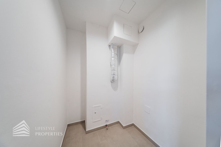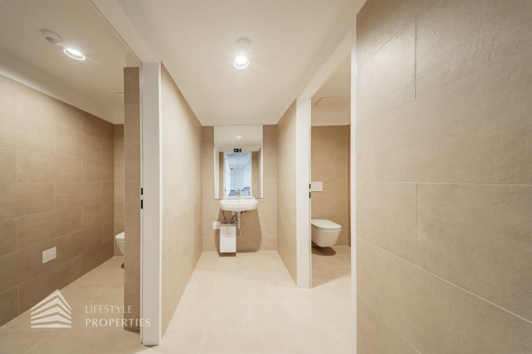 Beim Eingang befindet sich der ca. 13 m² große Empfang und ein Abstellraum. Durch einen ca. 14 m² langen Gang gelangt man zu den einzelnen Büroräumen. Am Ende des Ganges befindet sich ein Sozialraum mit einer Teeküche, die Toiletten für die Damen und Herren und ein Serverraum. Beim Empfang befindet sich zusätzlich ein Abstellraum. Die Fläche des Heizraumes wird auf vier Einheiten aufgeteilt.