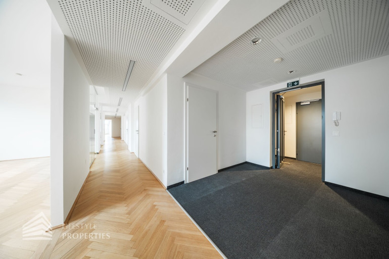 Beim Betreten des Büros befindet sich der ca. 4 m² große Vorraum mit einen ca. 25 m² großen Empfang. Rechts beim Eingang befinden sich die Toiletten für die Damen und Herren. Durch einen ca. 28 m² langen Gang gelangt man zu den einzelnen Büroräumen. Am Anfang des Ganges befindet sich ein Sozialraum mit einer Teeküche. Den Gang entlang befindet sich auf der rechten Seite ein Kopierraum und ein Badezimmer. Die Fläche des Heizraumes wird auf vier Einheiten aufgeteilt.