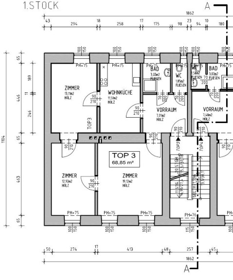 Die Wohnung befindet sich im 1 Stock. Das Haus besteht aus besteht aus einem Vollkeller und drei Obergeschosse.