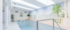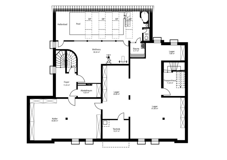 Besonderen Reiz bietet der tagesbelichtete Teil des Untergeschoßes mit dem ca. 50 m² großen Pool-Area mit Sauna, Infrarotkabine und Dusche/WC.