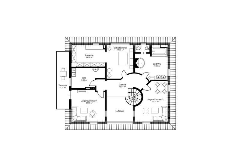 Gästezimmer und ein voll ausgestattetes Badezimmer. Das Dachgeschoß beeindruckt mit einer offenen Galerie und Zugang zum Master-Bedroom mit Ankleide, über komplett ausgestattetem Badezimmer