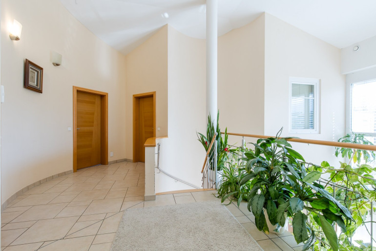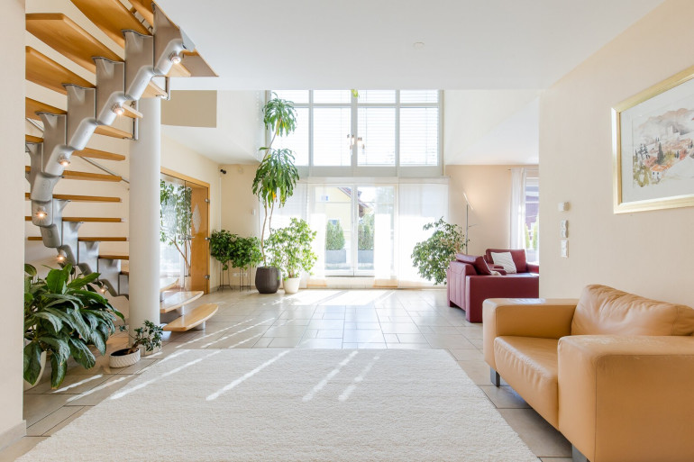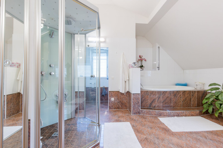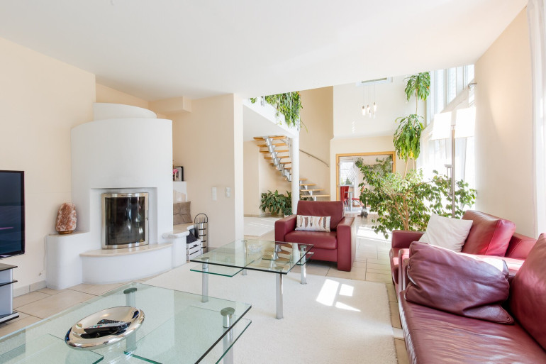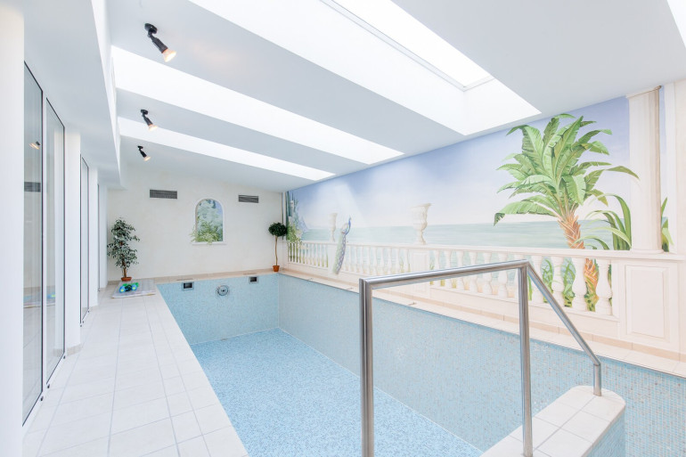 2003 in hochwertiger Massivbauweise (40-cm-Ziegelmauerwerk) errichtet, bietet die Gesamtfläche des Gebäudes von ca. 785 m² beeindruckende Raumhöhen und luxuriöse Ausstattungen, ein Hallenbad mit Wellnessbereich und Sauna, zwei große südseitige Terrassen und einen Wintergarten. Die sehr zeitgemäßen Ausstattungen reichen von großformatigen Fenstern mit Sicherheitsverglasung, zentraler Wärmeversorgung mittels Erdwärme-Fußbodenheizung mit automatischer Raumlüftung bis zu einer Alarmanlage.