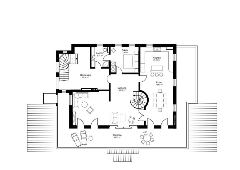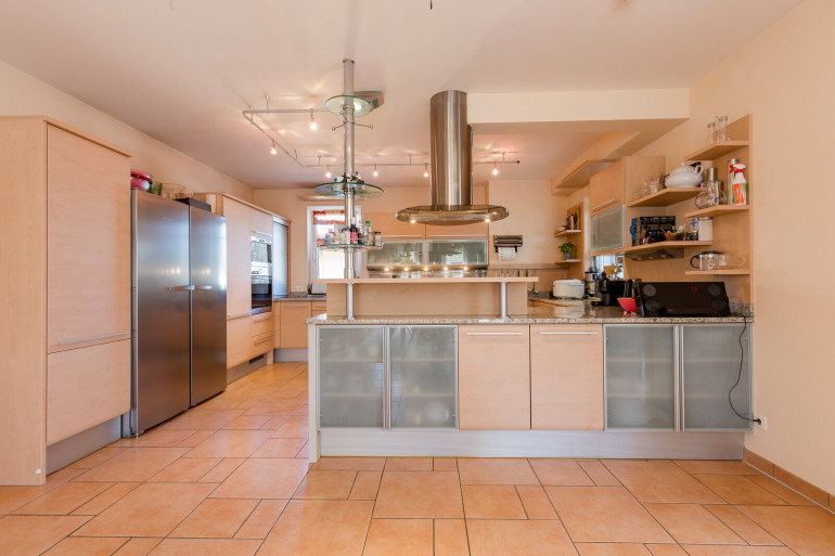Der ca. 46 m² große Speise- und Küchenbereich verbindet zum Wintergarten sowie zur großen Terrasse. Auf dieser Ebene befinden sich weiters ein