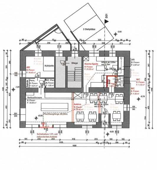 Weitere Flächen: ca. 57 m² Lagerkeller (derzeit leerstehend, vermietbar), 2 PKW-Stellplätze im Freien (vermietet), 1 Zweirad-Stellplatz im Freien, Schaukasten an der Ostseite (vermietet)