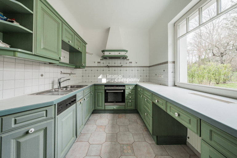 - großzügige, moderne Einbauküche mit großem Fenster in den Garten