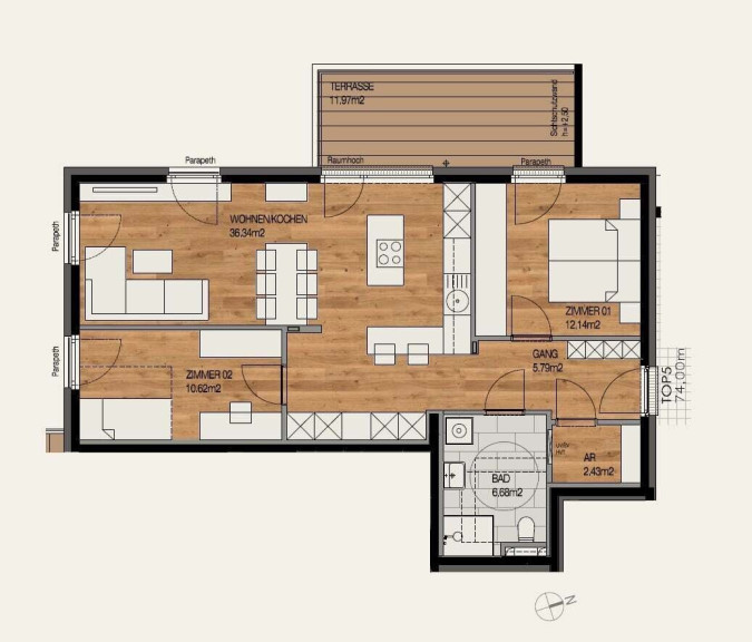 Die 3-Zimmer-Wohnung überzeugt durch eine durchdachte Raumaufteilung und eine hochwertige Bauweise. Die Wohnküche öffnet sich zur ca. 12 m² großen Terrasse, die nach Westen ausgerichtet ist. Die Wohnung ist barrierefrei über einen Aufzug erreichbar.