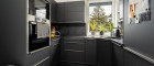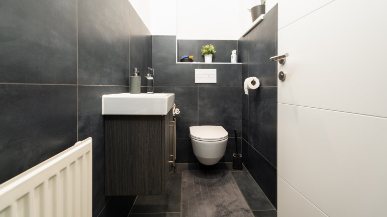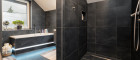 Erdgeschoss: rechterhand befindet sich ein WC mit Soundsystem. Ein Durchgang führt in die moderne Küche, ausgestattet mit hochwertigen LED-Lichtakzenten und einer Soundbox über das Smart-Home-System. Die Küche ist direkt mit dem Esszimmer verbunden, von dem aus eine kleine Terrasse erreichbar ist.