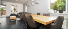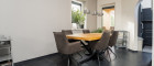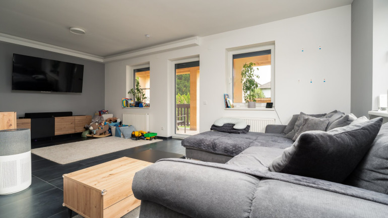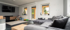 Der große Wohnbereich bietet viel Platz für die Familie. Auch hier wurde eine hochwertige indirekte Beleuchtung mit Farbsteuerung installiert. Zwischen Wohn- und Essbereich befindet sich ein Klimagerät sowie die Rauchfangstränge für einen möglichen Kaminanschluss. Eine Türe führt in den gepflegten Garten mit Terrasse.